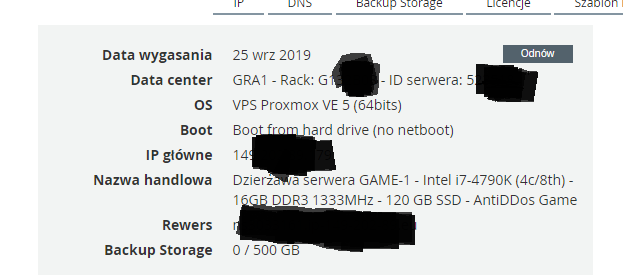 Witam, Posiadam na sprzedaż serwer dedykowany z serii GAME model GAME-1(https://www.soyoustart.com/pl/serwery-game/). Serwer ważny do 25 września 2019r. Cena to 85pln. Po zakupie rozpoczynamy proces cesji(trwa maksymalnie 14dni) - Inaczej proces przenoszenia usługi na inne konto 😃